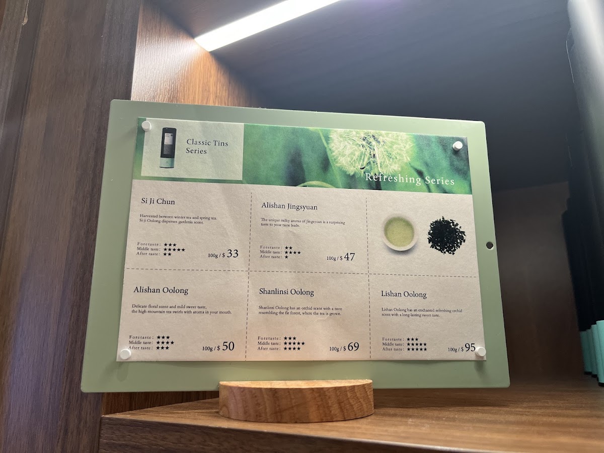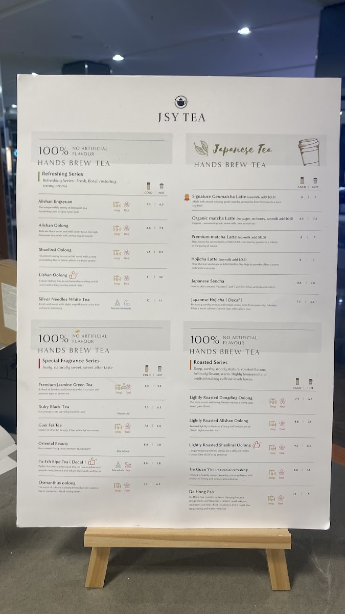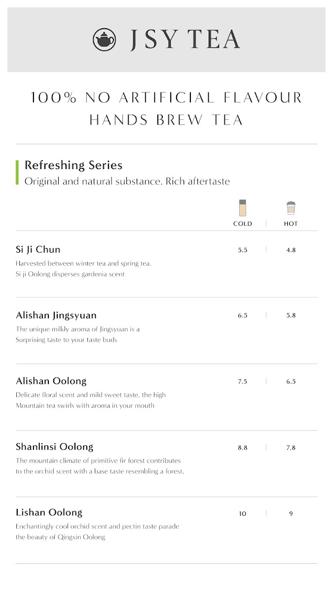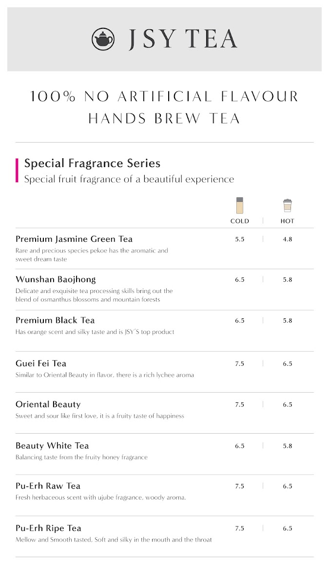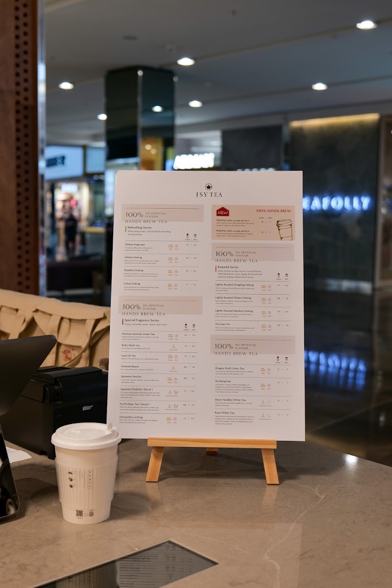 Jsy Tea at Westfield Doncaster offers a diverse menu that highlights premium teas and unique combinations. The Japanese Tea selection is a standout, featuring flavors like Organic Matcha, Premium Matcha, and Hojicha Powder, all perfect for those seeking authentic Japanese flavors. For a refreshing green tea experience, there's also Organic Gyokuro Green Tea and Organic Genmaicha Powder. The Classic Tins Series introduces specialty oolongs, including Alishan Oolong, Alishan Jingsyuan, and Shanlinsi Oolong, which are ideal for true tea connoisseurs. A distinctive feature of the menu is the Jsy Tea offerings, such as the Gongfu Tea + Sunnyhill Pineapple Cake and the Aged Pu-Erh Ripe Tea + Sunnyhill Pineapple Cake, blending delightful teas with a unique pastry. The Roasted Series includes carefully selected teas like Lightly Roasted Si Ji Chun Oolong, Lightly Roasted Dongding Oolong, and Tie Guan Yin, perfect for those who appreciate a rich, roasted flavor. Additionally, the menu offers teas like Premium Jasmine Green Tea, Ruby Black Tea, and more varieties of oolong such as Alishan Jingsyuan and Shanlinsi Oolong, offering something for every tea lover. The combination of premium tea selections and the signature Sunnyhill Pineapple Cake makes Jsy Tea a memorable stop for those in search of a unique and flavorful tea experience.